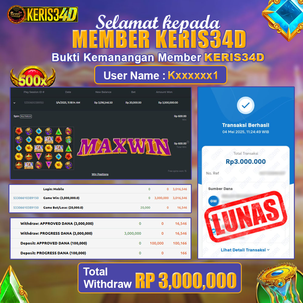 Setiap hari, member KERIS34D berhasil meraih jackpot besar dari berbagai provider slot ternama yang kami sediakan, seperti Pragmatic Play, Habanero, PG Soft, dan masih banyak lagi. Kami secara rutin menampilkan bukti screenshot atau rekapan kemenangan yang berhasil diraih, mulai dari kemenangan ratusan ribu hingga puluhan juta rupiah. Semua slip kemenangan ini kami hadirkan untuk membuktikan bahwa di KERIS34D, peluang menang itu nyata