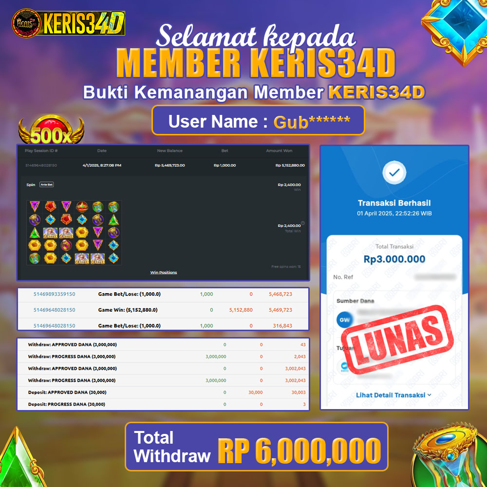 Setiap hari, member KERIS34D berhasil meraih jackpot besar dari berbagai provider slot ternama yang kami sediakan, seperti Pragmatic Play, Habanero, PG Soft, dan masih banyak lagi. Kami secara rutin menampilkan bukti screenshot atau rekapan kemenangan yang berhasil diraih, mulai dari kemenangan ratusan ribu hingga puluhan juta rupiah. Semua slip kemenangan ini kami hadirkan untuk membuktikan bahwa di KERIS34D, peluang menang itu nyata