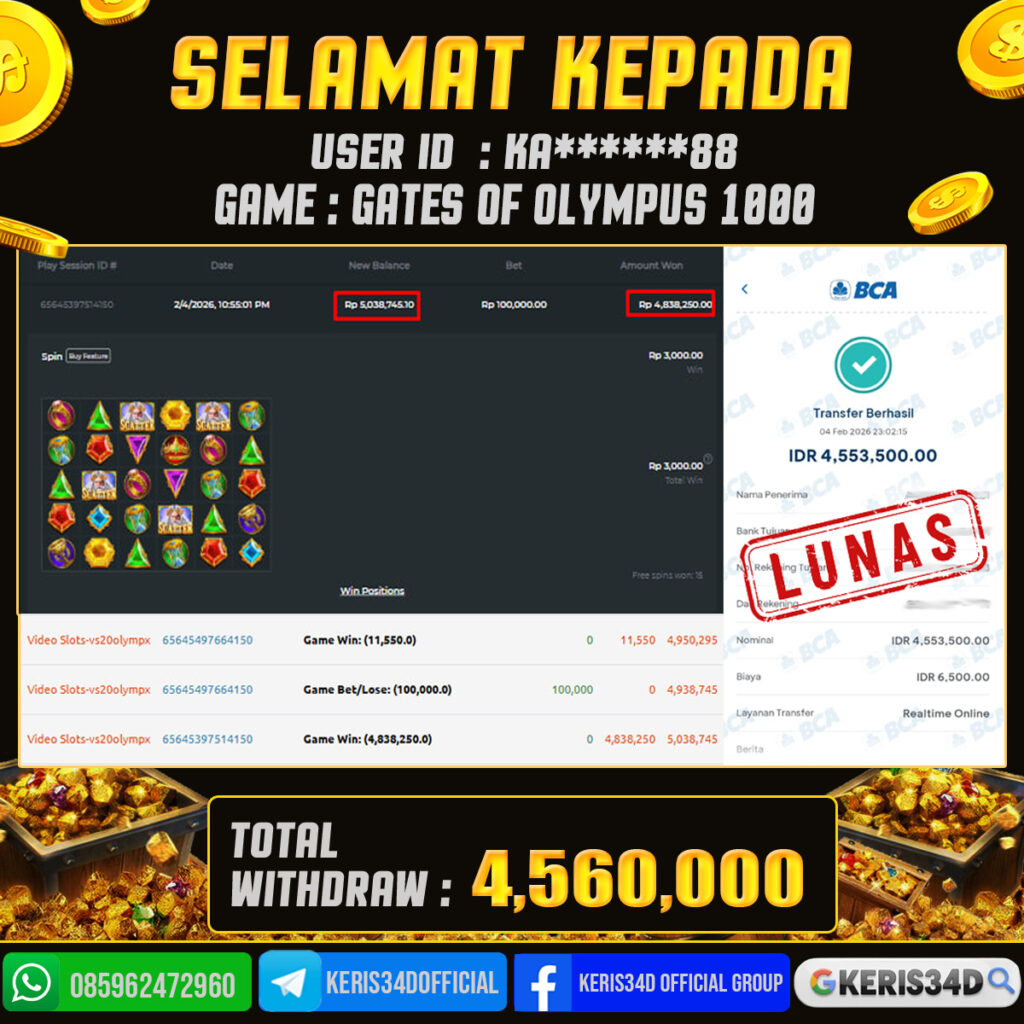 Setiap hari, member KERIS34D berhasil meraih jackpot besar dari berbagai provider slot ternama yang kami sediakan, seperti Pragmatic Play, Habanero, PG Soft, dan masih banyak lagi. Kami secara rutin menampilkan bukti screenshot atau rekapan kemenangan yang berhasil diraih, mulai dari kemenangan ratusan ribu hingga puluhan juta rupiah. Semua slip kemenangan ini kami hadirkan untuk membuktikan bahwa di KERIS34D, peluang menang itu nyata