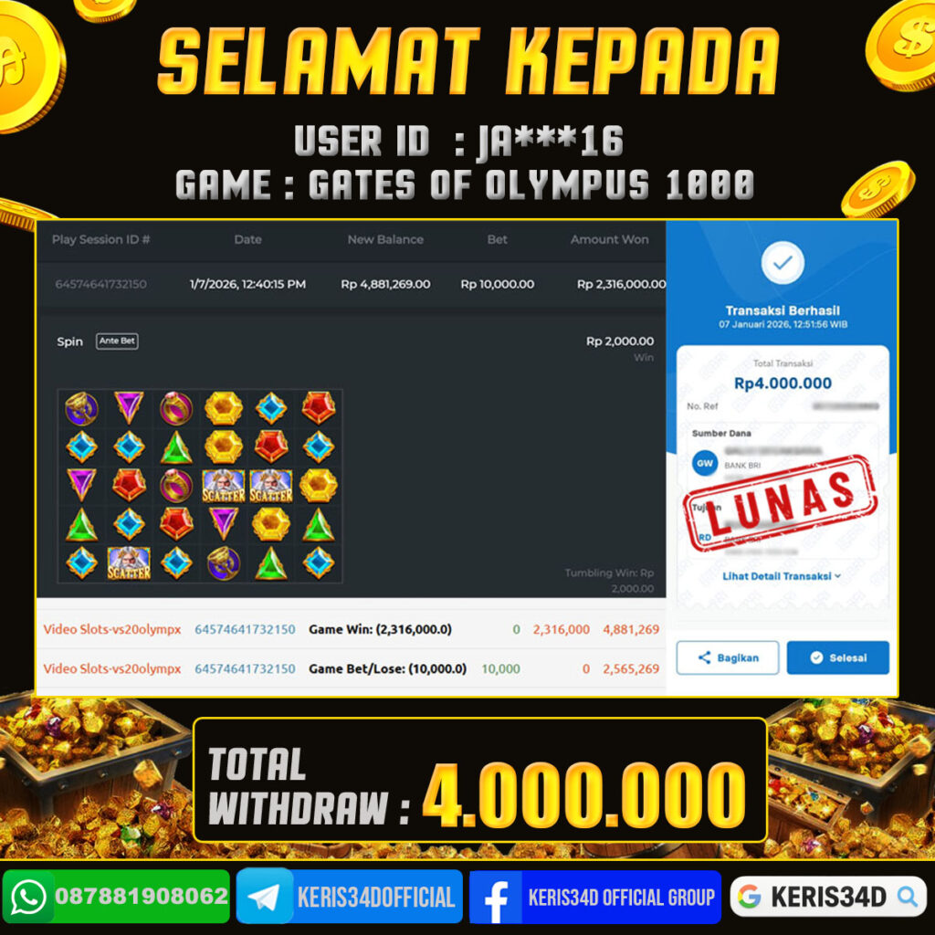 Setiap hari, member KERIS34D berhasil meraih jackpot besar dari berbagai provider slot ternama yang kami sediakan, seperti Pragmatic Play, Habanero, PG Soft, dan masih banyak lagi. Kami secara rutin menampilkan bukti screenshot atau rekapan kemenangan yang berhasil diraih, mulai dari kemenangan ratusan ribu hingga puluhan juta rupiah. Semua slip kemenangan ini kami hadirkan untuk membuktikan bahwa di KERIS34D, peluang menang itu nyata