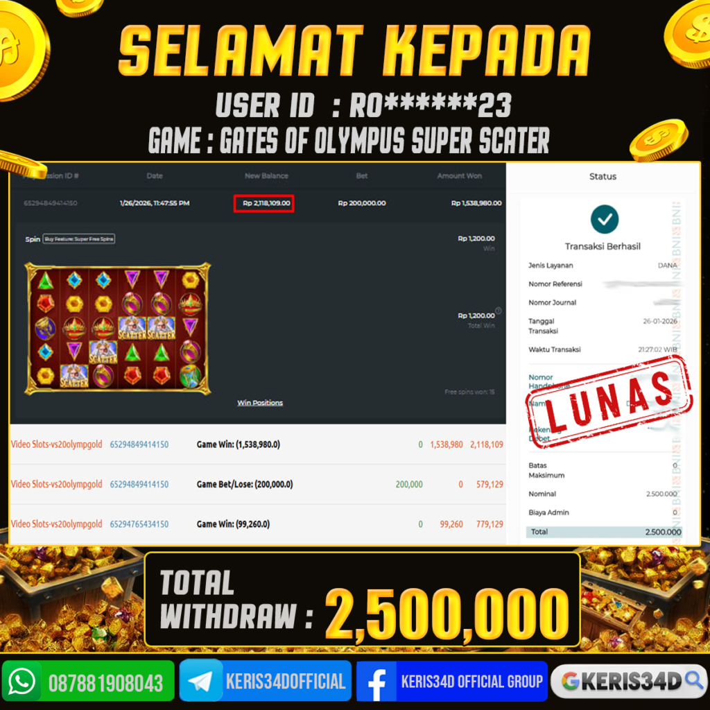 KERIS34D dikenal sebagai situs terpercaya yang selalu menghadirkan pengalaman bermain slot online yang aman, fair, dan berlisensi resmi. Di sini, kami tidak hanya sekadar memberikan janji, tapi bukti nyata berupa slip kemenangan yang dapat Anda lihat secara langsung.