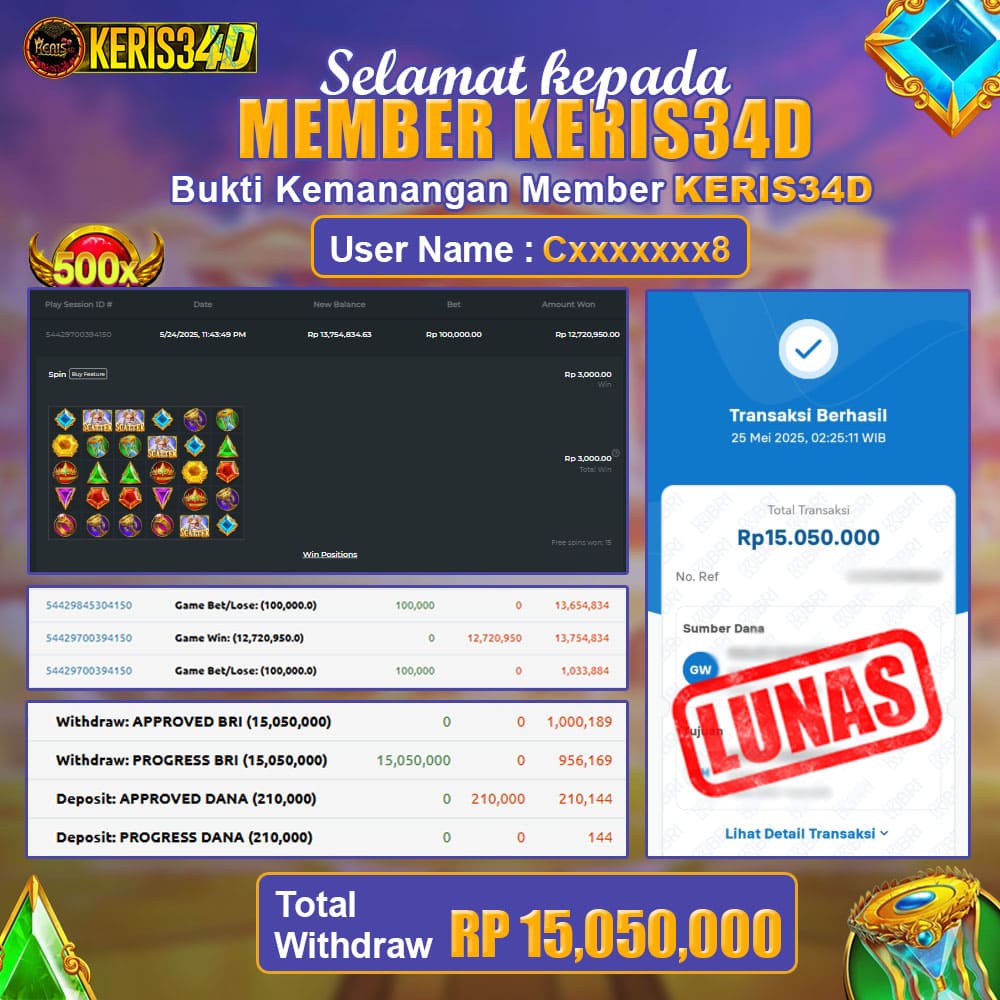 SSetiap hari, member KERIS34D berhasil meraih jackpot besar dari berbagai provider slot ternama yang kami sediakan, seperti Pragmatic Play, Habanero, PG Soft, dan masih banyak lagi. Kami secara rutin menampilkan bukti screenshot atau rekapan kemenangan yang berhasil diraih, mulai dari kemenangan ratusan ribu hingga puluhan juta rupiah. Semua slip kemenangan ini kami hadirkan untuk membuktikan bahwa di KERIS34D, peluang menang itu nyata