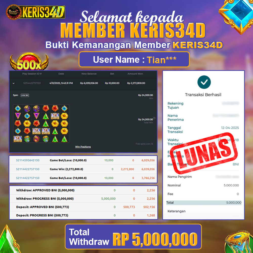 Setiap hari, member KERIS34D berhasil meraih jackpot besar dari berbagai provider slot ternama yang kami sediakan, seperti Pragmatic Play, Habanero, PG Soft, dan masih banyak lagi. Kami secara rutin menampilkan bukti screenshot atau rekapan kemenangan yang berhasil diraih, mulai dari kemenangan ratusan ribu hingga puluhan juta rupiah. Semua slip kemenangan ini kami hadirkan untuk membuktikan bahwa di KERIS34D, peluang menang itu nyata