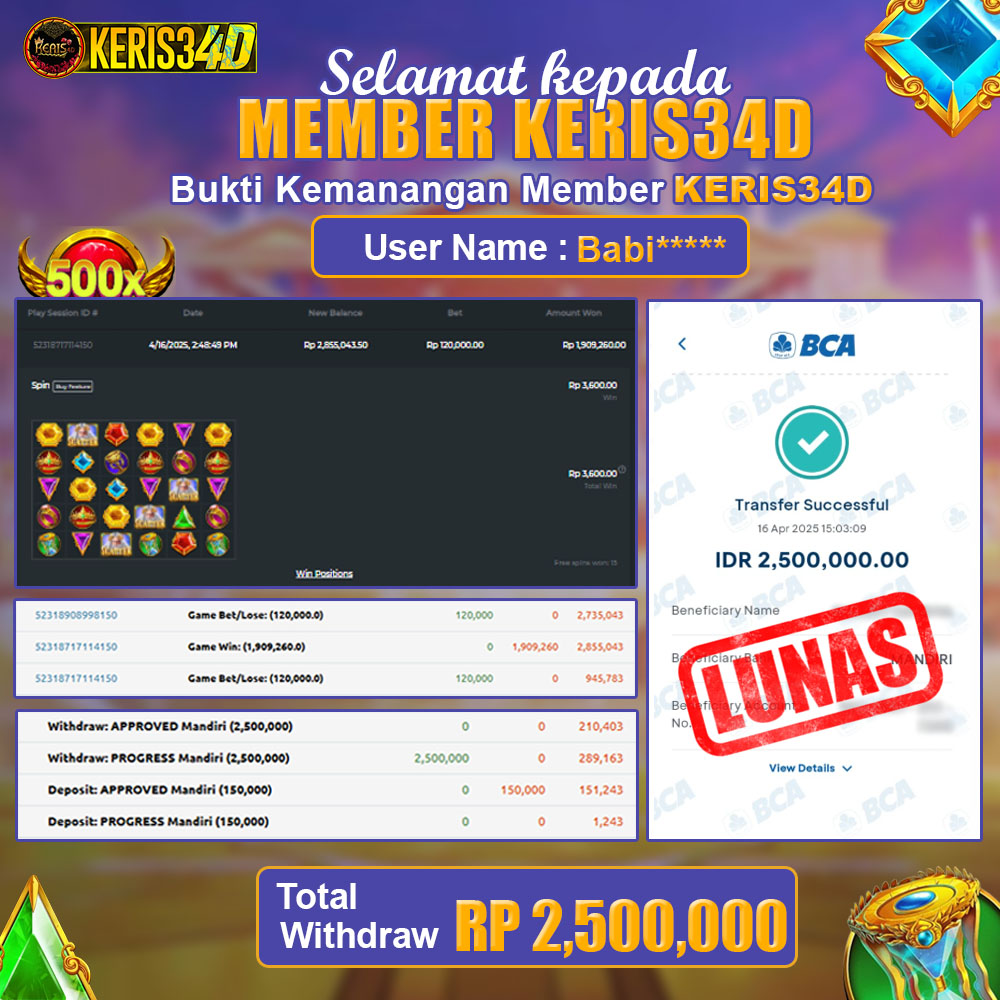 Setiap hari, member KERIS34D berhasil meraih jackpot besar dari berbagai provider slot ternama yang kami sediakan, seperti Pragmatic Play, Habanero, PG Soft, dan masih banyak lagi. Kami secara rutin menampilkan bukti screenshot atau rekapan kemenangan yang berhasil diraih, mulai dari kemenangan ratusan ribu hingga puluhan juta rupiah. Semua slip kemenangan ini kami hadirkan untuk membuktikan bahwa di KERIS34D, peluang menang itu nyata