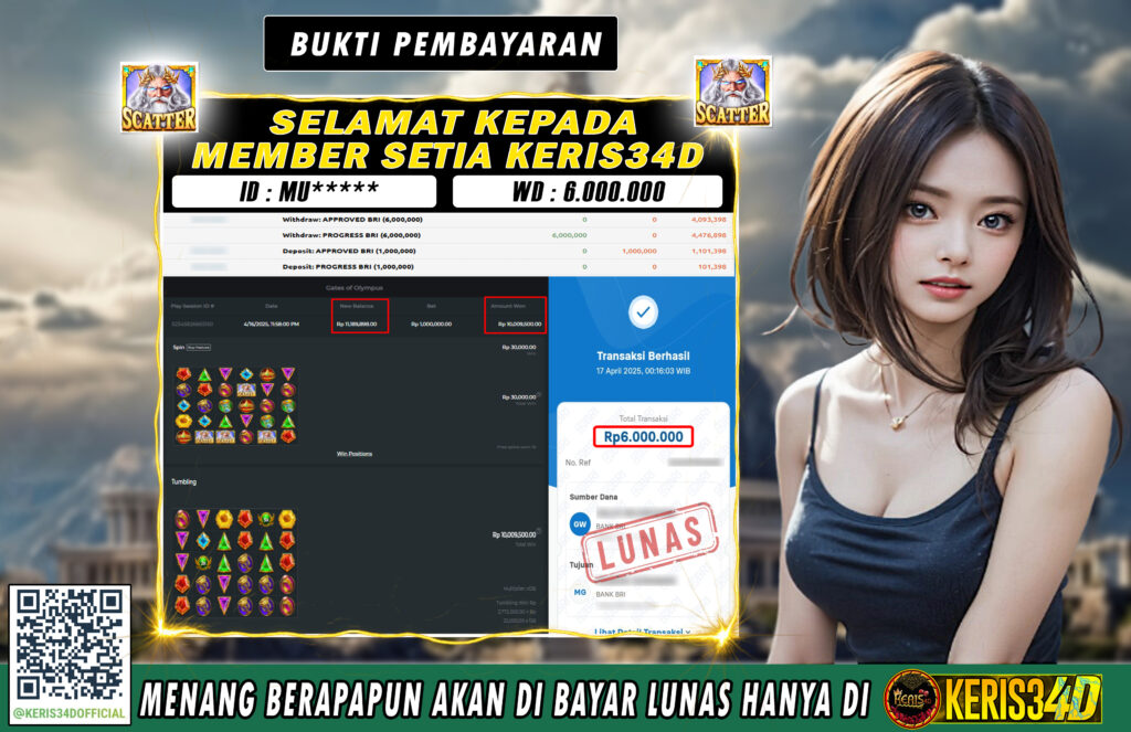Setiap hari, member KERIS34D berhasil meraih jackpot besar dari berbagai provider slot ternama yang kami sediakan, seperti Pragmatic Play, Habanero, PG Soft, dan masih banyak lagi. Kami secara rutin menampilkan bukti screenshot atau rekapan kemenangan yang berhasil diraih, mulai dari kemenangan ratusan ribu hingga puluhan juta rupiah. Semua slip kemenangan ini kami hadirkan untuk membuktikan bahwa di KERIS34D, peluang menang itu nyata