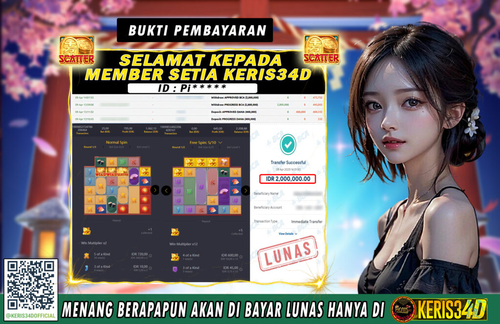 Setiap hari, member KERIS34D berhasil meraih jackpot besar dari berbagai provider slot ternama yang kami sediakan, seperti Pragmatic Play, Habanero, PG Soft, dan masih banyak lagi. Kami secara rutin menampilkan bukti screenshot atau rekapan kemenangan yang berhasil diraih, mulai dari kemenangan ratusan ribu hingga puluhan juta rupiah. Semua slip kemenangan ini kami hadirkan untuk membuktikan bahwa di KERIS34D, peluang menang itu nyata