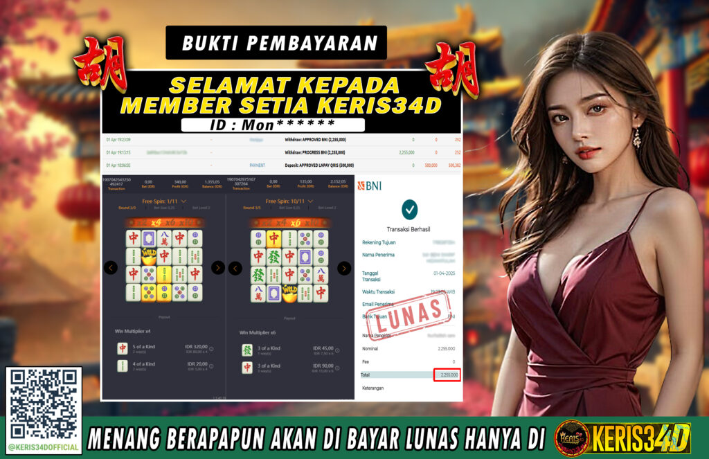 KERIS34D dikenal sebagai situs terpercaya yang selalu menghadirkan pengalaman bermain slot online yang aman, fair, dan berlisensi resmi. Di sini, kami tidak hanya sekadar memberikan janji, tapi bukti nyata berupa slip kemenangan yang dapat Anda lihat secara langsung.