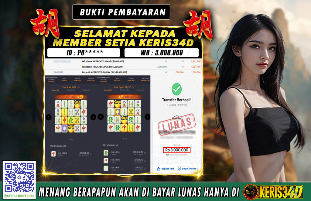 Setiap hari, member KERIS34D berhasil meraih jackpot besar dari berbagai provider slot ternama yang kami sediakan, seperti Pragmatic Play, Habanero, PG Soft, dan masih banyak lagi. Kami secara rutin menampilkan bukti screenshot atau rekapan kemenangan yang berhasil diraih, mulai dari kemenangan ratusan ribu hingga puluhan juta rupiah. Semua slip kemenangan ini kami hadirkan untuk membuktikan bahwa di KERIS34D, peluang menang itu nyata