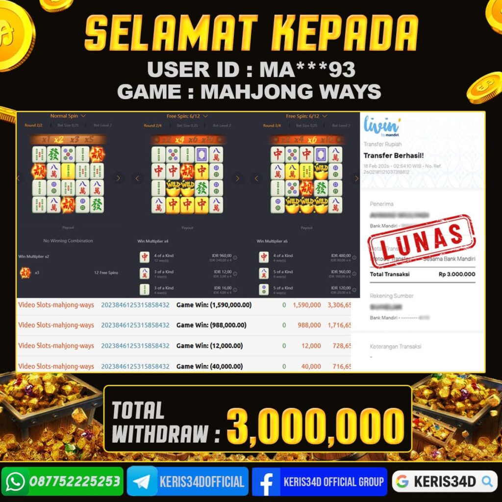 Setiap hari, member KERIS34D berhasil meraih jackpot besar dari berbagai provider slot ternama yang kami sediakan, seperti Pragmatic Play, Habanero, PG Soft, dan masih banyak lagi. Kami secara rutin menampilkan bukti screenshot atau rekapan kemenangan yang berhasil diraih, mulai dari kemenangan ratusan ribu hingga puluhan juta rupiah. Semua slip kemenangan ini kami hadirkan untuk membuktikan bahwa di KERIS34D, peluang menang itu nyata