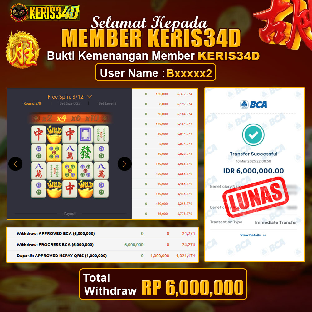 Setiap hari, member KERIS34D berhasil meraih jackpot besar dari berbagai provider slot ternama yang kami sediakan, seperti Pragmatic Play, Habanero, PG Soft, dan masih banyak lagi. Kami secara rutin menampilkan bukti screenshot atau rekapan kemenangan yang berhasil diraih, mulai dari kemenangan ratusan ribu hingga puluhan juta rupiah. Semua slip kemenangan ini kami hadirkan untuk membuktikan bahwa di KERIS34D, peluang menang itu nyata