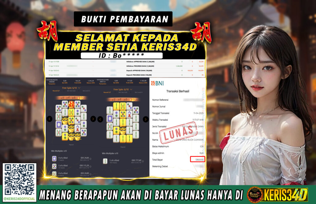 Setiap hari, member KERIS34D berhasil meraih jackpot besar dari berbagai provider slot ternama yang kami sediakan, seperti Pragmatic Play, Habanero, PG Soft, dan masih banyak lagi. Kami secara rutin menampilkan bukti screenshot atau rekapan kemenangan yang berhasil diraih, mulai dari kemenangan ratusan ribu hingga puluhan juta rupiah. Semua slip kemenangan ini kami hadirkan untuk membuktikan bahwa di KERIS34D, peluang menang itu nyata