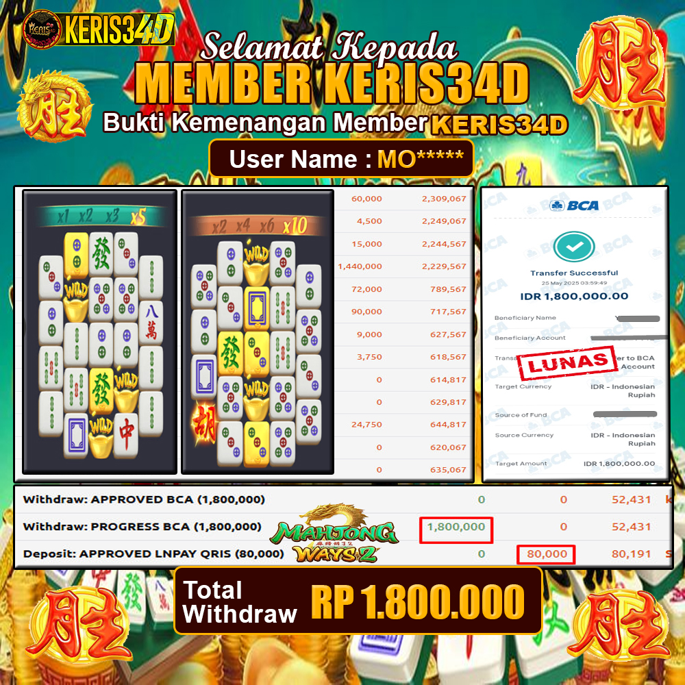 Setiap hari, member KERIS34D berhasil meraih jackpot besar dari berbagai provider slot ternama yang kami sediakan, seperti Pragmatic Play, Habanero, PG Soft, dan masih banyak lagi. Kami secara rutin menampilkan bukti screenshot atau rekapan kemenangan yang berhasil diraih, mulai dari kemenangan ratusan ribu hingga puluhan juta rupiah. Semua slip kemenangan ini kami hadirkan untuk membuktikan bahwa di KERIS34D, peluang menang itu nyata