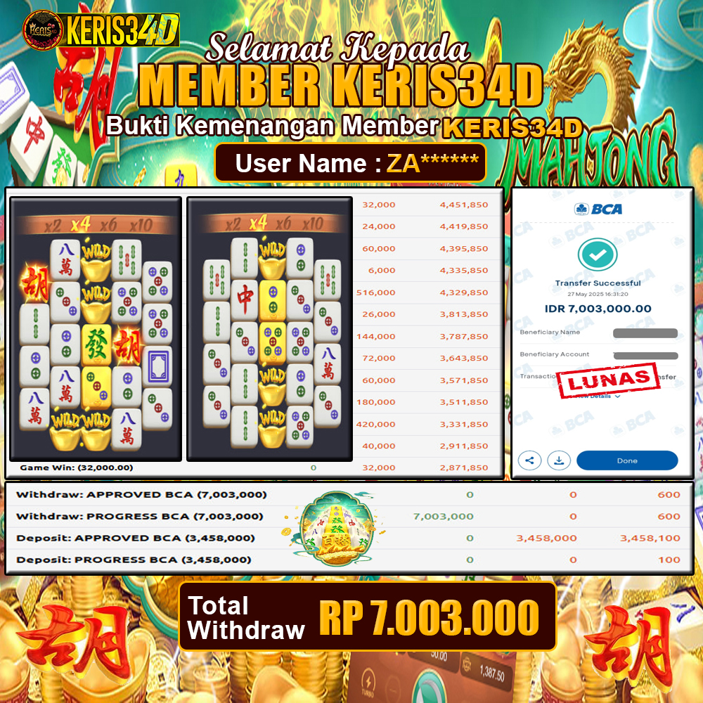 Setiap hari, member KERIS34D berhasil meraih jackpot besar dari berbagai provider slot ternama yang kami sediakan, seperti Pragmatic Play, Habanero, PG Soft, dan masih banyak lagi. Kami secara rutin menampilkan bukti screenshot atau rekapan kemenangan yang berhasil diraih, mulai dari kemenangan ratusan ribu hingga puluhan juta rupiah. Semua slip kemenangan ini kami hadirkan untuk membuktikan bahwa di KERIS34D, peluang menang itu nyata