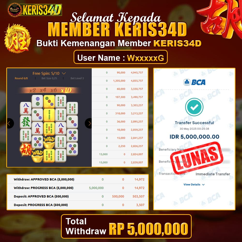 Setiap hari, member KERIS34D berhasil meraih jackpot besar dari berbagai provider slot ternama yang kami sediakan, seperti Pragmatic Play, Habanero, PG Soft, dan masih banyak lagi. Kami secara rutin menampilkan bukti screenshot atau rekapan kemenangan yang berhasil diraih, mulai dari kemenangan ratusan ribu hingga puluhan juta rupiah. Semua slip kemenangan ini kami hadirkan untuk membuktikan bahwa di KERIS34D, peluang menang itu nyata