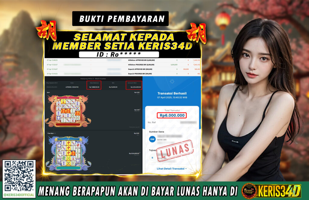 Setiap hari, member KERIS34D berhasil meraih jackpot besar dari berbagai provider slot ternama yang kami sediakan, seperti Pragmatic Play, Habanero, PG Soft, dan masih banyak lagi. Kami secara rutin menampilkan bukti screenshot atau rekapan kemenangan yang berhasil diraih, mulai dari kemenangan ratusan ribu hingga puluhan juta rupiah. Semua slip kemenangan ini kami hadirkan untuk membuktikan bahwa di KERIS34D, peluang menang itu nyata