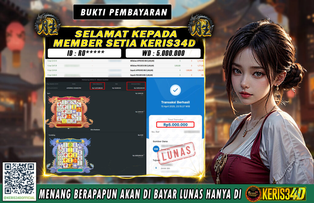 Setiap hari, member KERIS34D berhasil meraih jackpot besar dari berbagai provider slot ternama yang kami sediakan, seperti Pragmatic Play, Habanero, PG Soft, dan masih banyak lagi. Kami secara rutin menampilkan bukti screenshot atau rekapan kemenangan yang berhasil diraih, mulai dari kemenangan ratusan ribu hingga puluhan juta rupiah. Semua slip kemenangan ini kami hadirkan untuk membuktikan bahwa di KERIS34D, peluang menang itu nyata