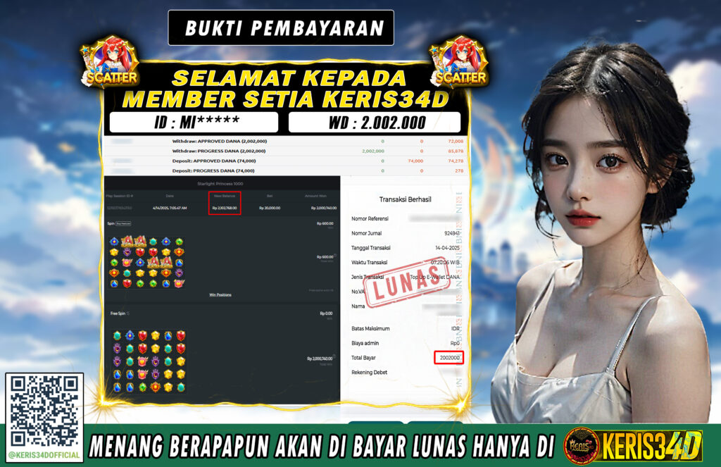 Setiap hari, member KERIS34D berhasil meraih jackpot besar dari berbagai provider slot ternama yang kami sediakan, seperti Pragmatic Play, Habanero, PG Soft, dan masih banyak lagi. Kami secara rutin menampilkan bukti screenshot atau rekapan kemenangan yang berhasil diraih, mulai dari kemenangan ratusan ribu hingga puluhan juta rupiah. Semua slip kemenangan ini kami hadirkan untuk membuktikan bahwa di KERIS34D, peluang menang itu nyata