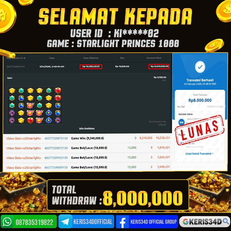 Setiap hari, member KERIS34D berhasil meraih jackpot besar dari berbagai provider slot ternama yang kami sediakan, seperti Pragmatic Play, Habanero, PG Soft, dan masih banyak lagi. Kami secara rutin menampilkan bukti screenshot atau rekapan kemenangan yang berhasil diraih, mulai dari kemenangan ratusan ribu hingga puluhan juta rupiah. Semua slip kemenangan ini kami hadirkan untuk membuktikan bahwa di KERIS34D, peluang menang itu nyata