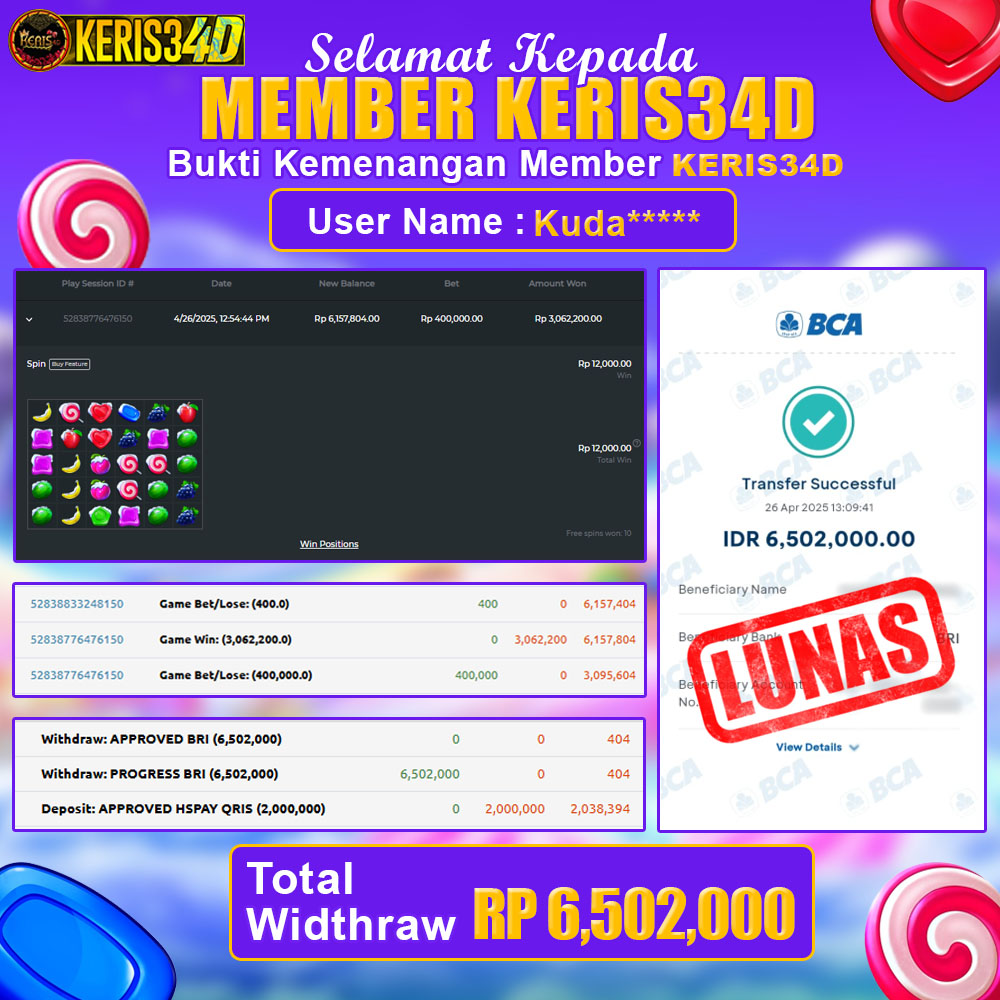 Setiap hari, member KERIS34D berhasil meraih jackpot besar dari berbagai provider slot ternama yang kami sediakan, seperti Pragmatic Play, Habanero, PG Soft, dan masih banyak lagi. Kami secara rutin menampilkan bukti screenshot atau rekapan kemenangan yang berhasil diraih, mulai dari kemenangan ratusan ribu hingga puluhan juta rupiah. Semua slip kemenangan ini kami hadirkan untuk membuktikan bahwa di KERIS34D, peluang menang itu nyata