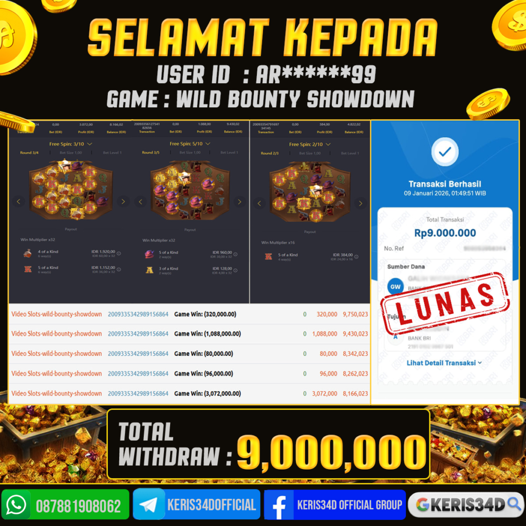 Setiap hari, member KERIS34D berhasil meraih jackpot besar dari berbagai provider slot ternama yang kami sediakan, seperti Pragmatic Play, Habanero, PG Soft, dan masih banyak lagi. Kami secara rutin menampilkan bukti screenshot atau rekapan kemenangan yang berhasil diraih, mulai dari kemenangan ratusan ribu hingga puluhan juta rupiah. Semua slip kemenangan ini kami hadirkan untuk membuktikan bahwa di KERIS34D, peluang menang itu nyata